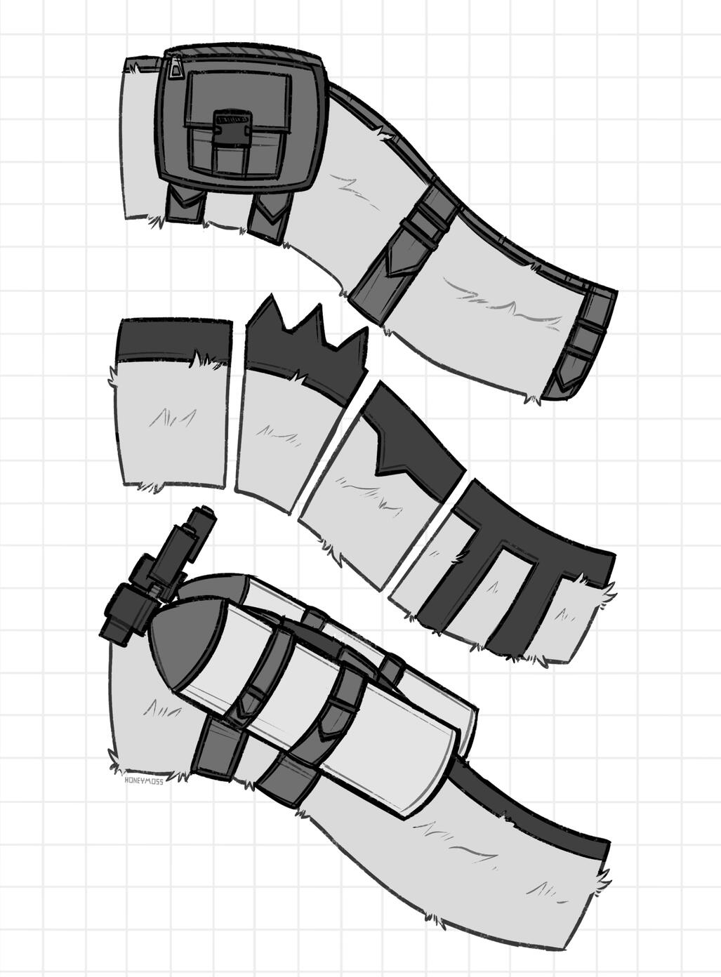 Mantled Beasts commonly use various types of strips as support equipment whether it be to carry extra weight, items, or to produce extra light. These strips are highly customizable and are often used by Mantled Beasts out of their work field to show off different designs and colours.These strips are commonly located on the tail, the waist, the back, and occasionally the front. Not all have to be present, but Beasts tend to prefer having the tail and waist supported in daily life as it provides the opportunity to show their style or carry more items.These body strips are generally located in the same areas but are able to interlock and connect or disconnect in different ways. For example some Mantled beasts will have a strip that connects from the back of their visor fully down their tail / around their waist, while some may prefer to not use the back support and opt in for better tail or waist support. A back connection generally provides better weight support on the tail, but for lighter accessories and displays it may not be as important.