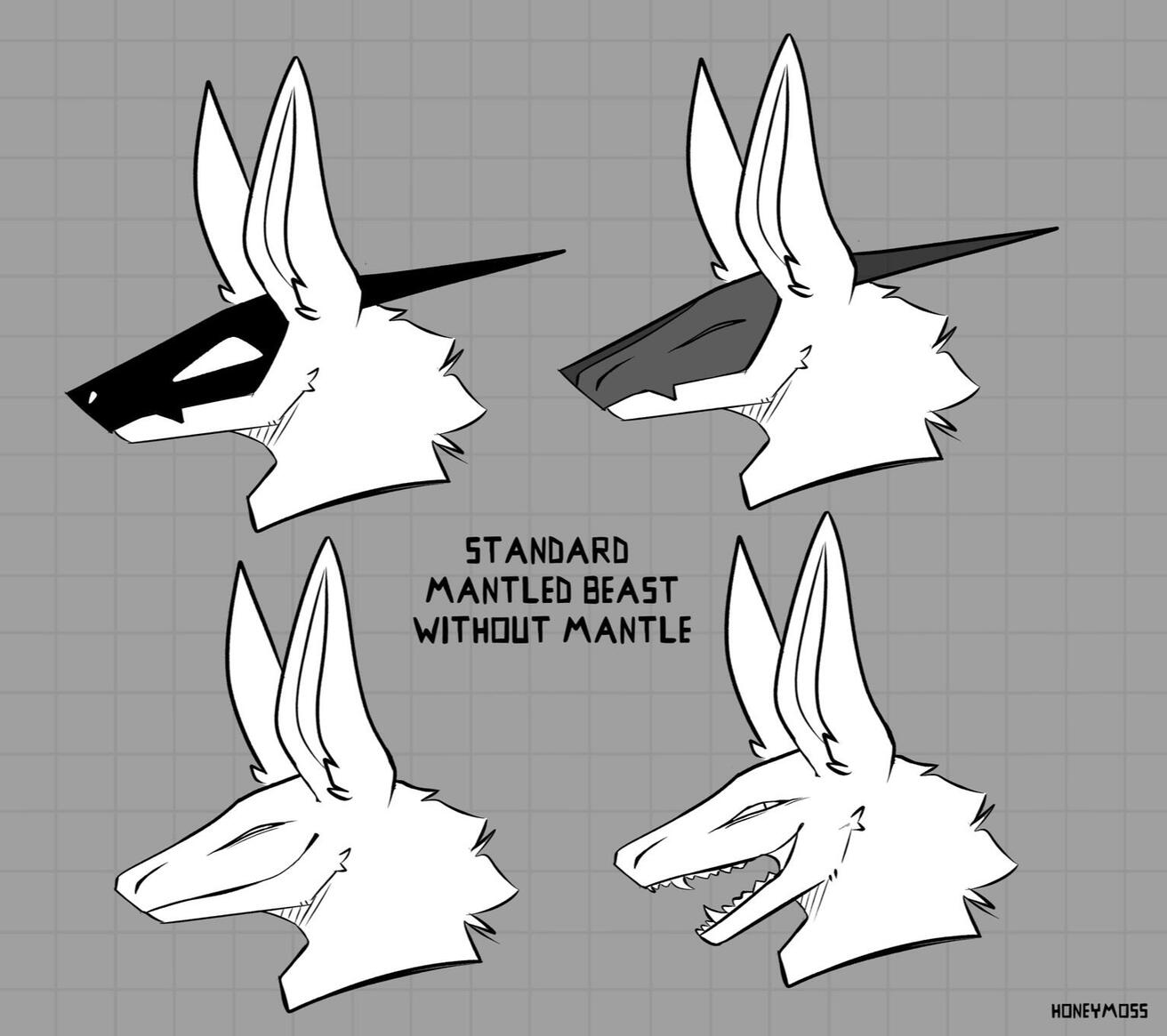 Mantled Beasts are fully organic creatures. While they use a lot of technology in their daily life, none of it is permanently attached and can be swapped out for different uses.The standard height for a mantled beast is around 6' including their ears.Mantled Beast designs can vary greatly but these variations shouldn't take away too much from their general anatomy. While creativity is highly encouraged, they should still remain fully recognizable as Mantled Beasts!