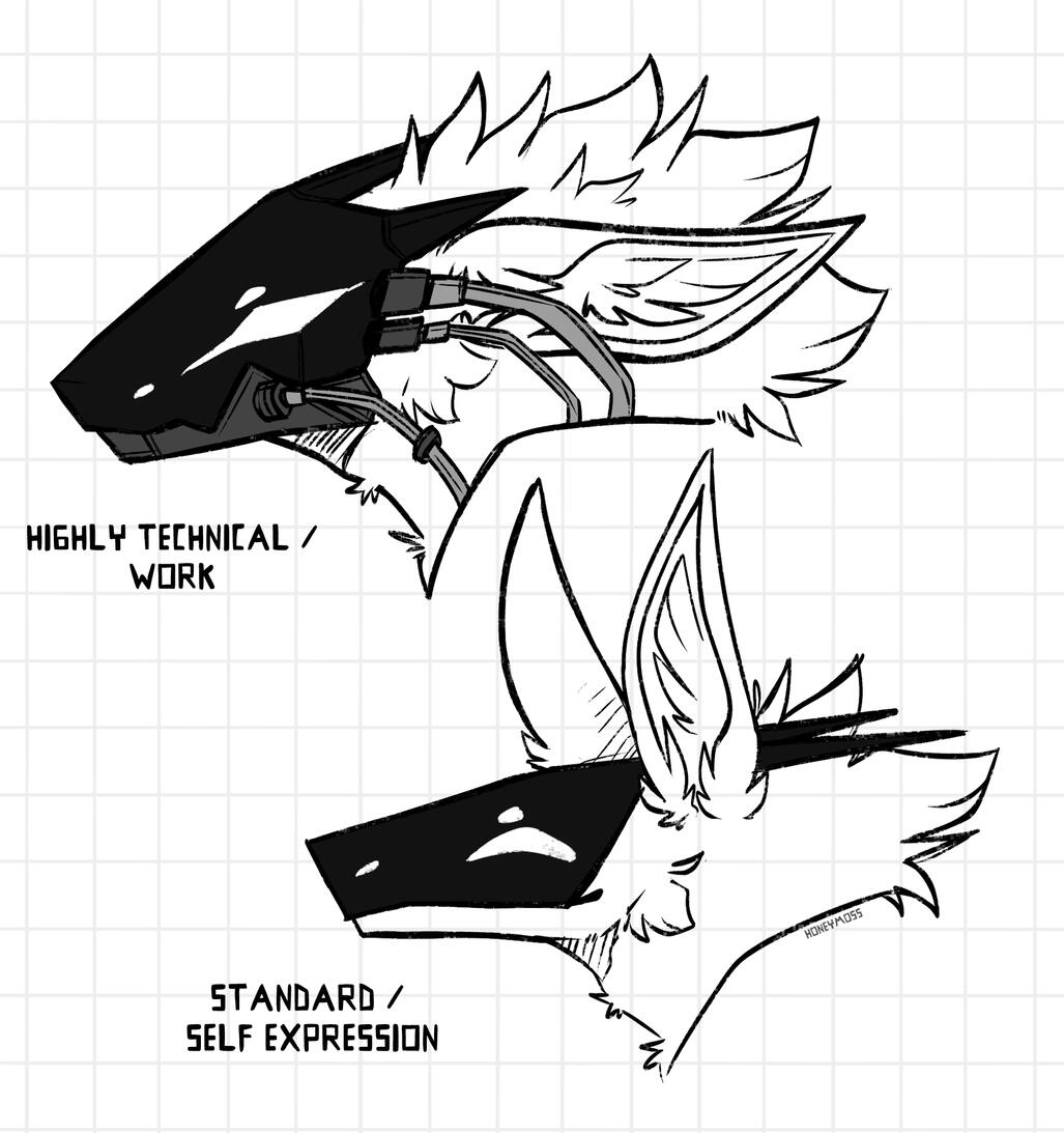 Mantled Beasts generally have different types of visors for different purposes, but the most common one you'll see is a standard type visor that is mainly used for the individuals self expression. These standard visors tend to be more simple in design and may have different horn types, colours, functions, etc. These visors have tech in them that allow Mantled Beasts to perform simple tasks that help out in daily life or communication.Work visors tend to be more technical and are generally built for more specific purposes. These arent worn all the time by Mantled Beasts as they prefer to wear a standard visor outside of their work. These visors vary per job and may be more or less advanced than another. A space farer may have a technically more impressive visor than a librarian but they both serve their own unique purposes.